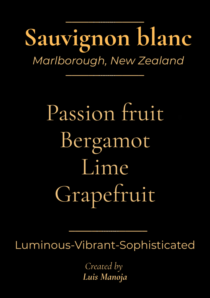 Passion fruit, pomarade, lime, bergamota… The Sauvignon Blanc from Marlborough smells this way because its climate, soil, grape variety, and proximity to the sea combine to produce vibrant citrus, herbal, and mineral aromas, which are then perceived as a fresh, electric, and lively fragrance.